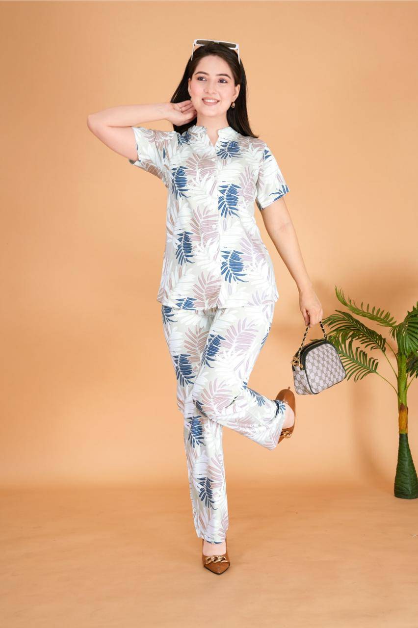 Breezy, beautiful, and effortlessly refined — this relaxed-fit co-ord set is crafted from premium textile rayon, offering an ultra-soft feel with graceful drape. The front-open silhouette with a kurta collar lends a touch of structure, while the soothing pastel floral print brings calm sophistication. Perfect for day strolls or slow evenings, it’s lounge luxury at its finest.