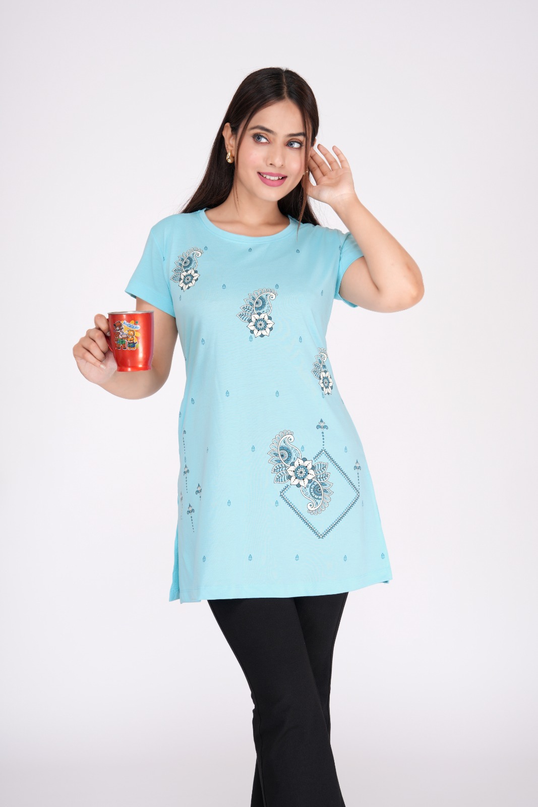 Crafted from premium cotton hosiery, this women’s long top blends comfort with quiet elegance. A refined front print adds just the right touch of detail, making it effortlessly wearable. Designed for those who value quality over trends—subtle, timeless, and made to last. Let your style speak softly.